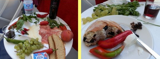 Pak došlo na housky. Nabídla mi speciální místní, černaly se olivami. Hodně pokrčený nos, ústa - půlměsíc dolů, dráty na hlavě se roztřásly… Mám se pomalu k placení, když říká: „E vino?" A víno? Tváří se jako, když někomu, kdo se chystá skočit do auta a odjet, připomínáme: „A co takhle klíčky? Nehodily by se?" No tak koukám na ty flašky a zase si nemohu vybrat. „Rosso.", spíše mi oznamuje. Jasně, vybírám mezi červenými. Zrak mi padne na láhev s výrazným nápisem PRIMITIVO. „To beru. Hodí se to ke mně." Ukazuju na sebe a pak na to víno. Tváří se, jako, že jsme na stejné bárce a smějeme se.