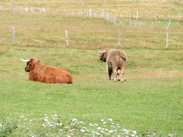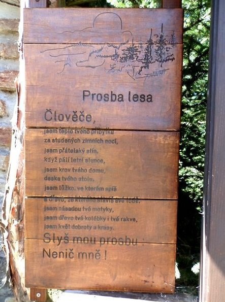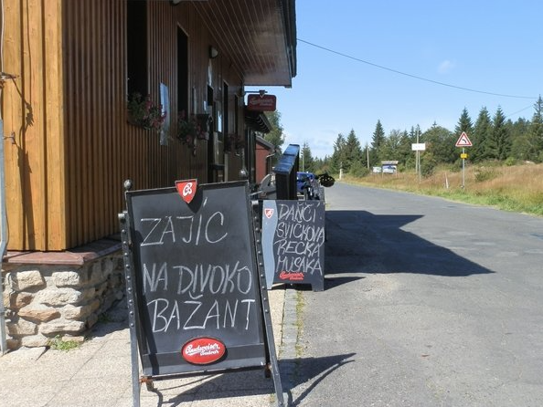 Pustil jsem se kolmo – tedy na kole, vzhůru lesem, kolem studánky a kapličky na Filipovu Huť. Po cestě se kochal zvířátky skoro jako na safari. Tu podivné krávy, připomínající tibetské jaky, hnědé kozenky, když jsem popíjel vodu ze studánky, přiběhl nádherný velký vlčák a bystře sledoval, jak si fotím text vyrytý do dřeva, když jsem namířil objektiv na něj, zmizel… asi se nerad fotí… pak jsem zahlídl bílou kočku, jak obezřetně našlapuje travou, na pasekách živé květy motýlků… A poprvé letos jsem se dosyta napásl borůvkami. Po kratším okruhu kolem Filipky jsem jako magnetizován, kolem poledne, zaparkoval u penzionu Korýtko. Pokochal se vyvěšeným jídelákem a radostně vstoupil. Jsem totiž kulajdový typ…