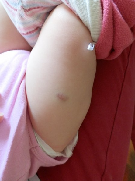 Utrpěla tři vakcinace Hexavakcínou. Po každém vpichu měla asi týden horečku, rýmu a kašel. Po té se v podkoží pod vpichem vytvořil tuhý vejčitý útvar s temně fialovým zbarvením kůže. Detail jednoho stehýnka je na třetí fotografii. Kdybyste jemně zmáčkli podkoží pod skvrnou palcem a ukazováčkem, zjistili byste, že je velikosti kachního vejce. Na druhém stehýnku má tyto útvary dva vedle sebe. Po každém očkování jeden. Nezmenšují se, zůstávají bez vývoje. Matka se třikrát po očkování ptala pediatra, co to má být a zda tyto potíže nesouvisejí s očkováním. Pokaždé byla striktně informována, že nikoliv. Na otázku co s tím, odpověď – nic, to přejde. Po této zkušenosti se rodiče pevně rozhodli už nikdy neočkovat. Plně jsem je v tom podpořil. Opakovaně, takřka dnes a denně se ujišťuji o tom, že běžní pediatři NEJSOU odborníky na očkování a že prakticky nevědí, co dělají. Navíc se chovají ve své neznalosti samolibě. Jen tak bezděčně urychlují pád gigantického vakcinačního podvodu…