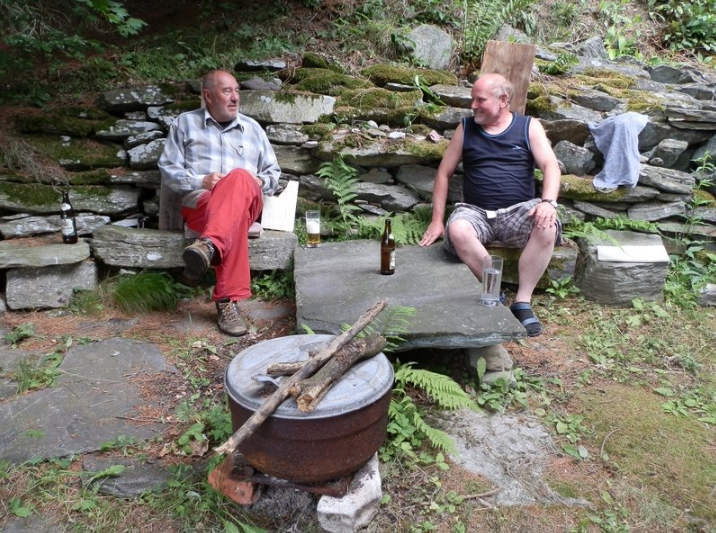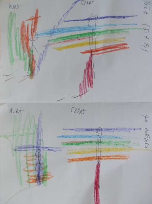 Dnes, 5. července v poledne (kolem roku 2014....) jsem provedl před chalupou Ing. Pytlíka v lese poblíž Hojsovy Stárže na Šumavě, autopatický pokus.Dech nosem bez vaření. Prolil jsem v čistém prameni lahvičkou cca 16 litrů ( osm minut). Pokus měl dva aspekty. Za prvé nebyly dodrženy standartní podmínky v tom smyslu, že proud byl velmi silný, takže jsem lahvičku musel zaklínit cihlou, aby se nepovalila a voda divoce cákala na všechny strany - viz 1. foto. Přesto vnitřkem lahvičky neustále protékala voda, což jsem kontroloval pohledem na nepřerušovaný výtok z trubičky. To mi, odpusťte, evokuje výkřik prostatika po úspěšné operaci: A přece se močí! No, nic, pokračujem... Na místě byl přítomen i známý plzeňský jasnovidný léčitel, Ing. Petr Mojžíš. Viz foto 2 - s kolegou Pytlíkem. Ing. Petr Mojžíš je hned druhý zleva. Je to ten prvý zprava v trekách. Já vím, že to vypadá, jak z Cimrmana, ale to já schválně. Berte, i přes to, tento text se vší vážností. Pan Mojžíš mimo jiné, automatickou kresbou maluje - a to barevně! aury a čakry. Požádal sem ho, aby mi namaloval auru + čakrový systém. Totéž udělal cca deset minut po aplikaci autopatické informace na 6. čakru. Viz foto 3. Standartně se prý aura takto výrazně může změnit za několik let. Nemohu zde rozebírat interpretace těchto obrazů. Důležitý a naprosto evidentní je dramatický ROZDÍL v obou záznamech! Zejména v auře, kde fialová barva značí duchovní kvalitu. Na první kresbě se mi poněkud vytrácí někam dozadu, z atím co na druhé, vytváří velký kříž! Ing. Mojžíš mě ale hned upozornil, že to nemusí trvat dlouho...záleží na mé duchovní práci. Autopatie nám takto dává neuvěřitelnou - ŠANCI! Chápu, že (i při častém opakování), nemůže zaručit absolutní Uzdravení. Všimněte si, jak jsou čakry na druhém obrázku pravidelně uspořádány. Také je patrné vymizení černých čáreček (drobné znečištění aury něčím temným). Ještě doplním, co není z malůvek patrné. Ing. Mojžíš maluje bez intelektu, ve změněném stavu vědomí. A tak používá i bílou pastelku, v daném případě na bílém papíře... Na prvém obr. mi z hlavy stoupá bílý sloupek šikmo do zadu a na druhém mnohem silnější naprosto vertikálně. To bylo vidět jen, když papír nahnul trochu starnou a tak to šikmé světlo odhalilo. Prostě se to zalesklo. Tož tak... Autopatická pomoc budí respekt.... není to palcebo. I když se samozřejmě může (to je OK) navázat na jakoukoliv metodu, včetně třeba artroskopie kolene. Je to šance. A to uvažte, že šlo o dech... Jsem zvědav na pránu...až se někdy zase takto sejdeme, vyzkoušíme to. Neboť prána na mě působí výrazně lépe než dech...