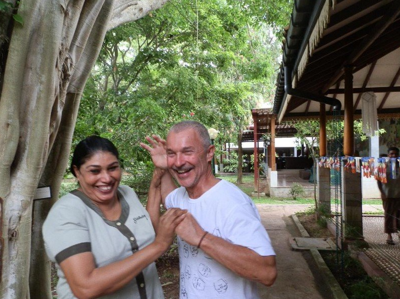 Obrázek druhý: Pár sinhálských slov ovládám. Jeden z výrazů, který často používám je Elle kiri a zdvihnu palec nahoru. Elle je kráva kiri je mléko. To je na Cejlonu taková hláška, jako u nás třeba Buď fit! Je to o energii, o síle, řikaj si to mezi sebou chlapi. Něco jako Ať nám stojí… No a jak já to tu pořád říkám (vžycky se smějou a taky to řeknou a daj palec vzhůru), tak oni mi tady v místě, kam jezdim, už tak prostě říkaj. Mám zkrátka srílanskou přezdívku Elle kiri.