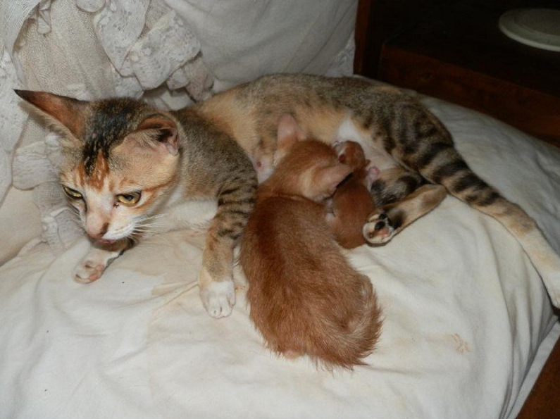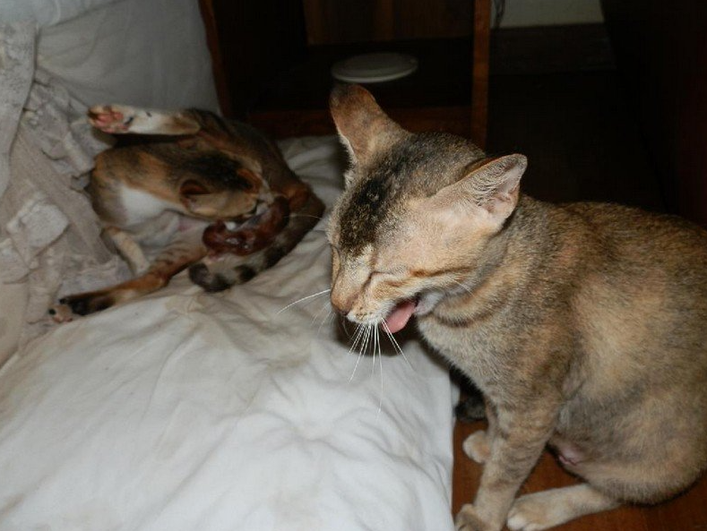 Jednou přišla další těhule a vešla ke mně do pokoje. Koukal jsem, co bude. Kočeny na sebe chvíli hleděly a syčely. Nová ulehla vedle staré a začala kojit jedno kotě té, co tu bydlela. Za chvíli začala