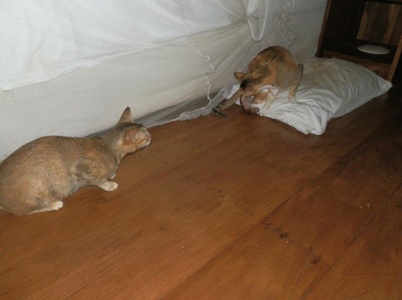Třetí obrázek je čistě kočičí. Nepouštím klimošku a nechávám imrvére otevřeno. Jen záclonky vlají. A tak se ke mně stahují kočiny za účelem bezpečného útulku a taktéž rození mláďat. Hned se ke mně jedna nastěhovala a nanosila si asi 10ti denní koťata. Tři. Tak tady panovala pohodička, koťata rostla, hrála si a dobře se měla. Já v noci musel dycky opatrně šoupat nohama, když jsem šel na záchod, abych nějaký nenakopnul. Nosil jsem matce kousky rybičky z restaurace. Stravovala se tedy ayurvédsky a bydlela asi 80 metrů od Indického oceánu. S výhledem na moře i restauraci.